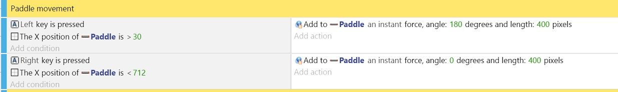 Now you need to add a corresponding action to the condition. The paddle should move left on a horizontal axis if the condition is met.